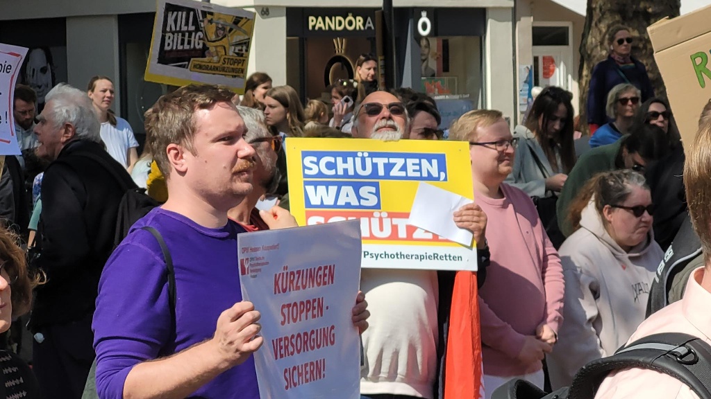 Psychotherapeutinnen und Psychotherapeuten, Patientinnen und Patienten sowie Unterstützer aus dem Gesundheitswesen setzen gemeinsam ein sichtbares Zeichen. Der Protest richtet sich gegen die aktuelle Kürzung