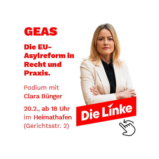 20. Februar Podiumsdiskussion mit u.a. Clara Bünger(MdB) im Heimathafen, WI Gerichtsstr. 2 (Linien 3 und 6 bis Adelheidstr.), Thema: GEAS (neue EU-Asylreform) und die Auswirkungen (Recht und Praxis), 18:30 Uhr
