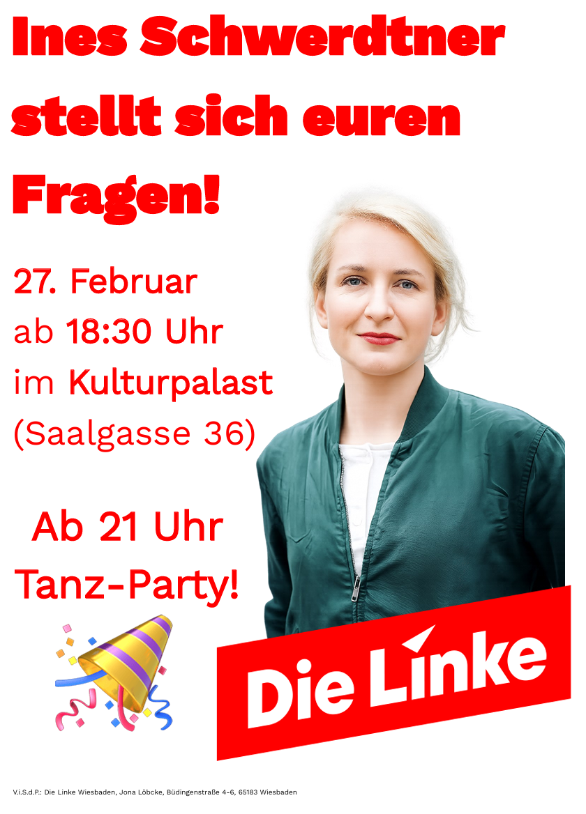 27. Februar Veranstaltung mit Ines Schwerdtner, Parteivorsitzende in WI (Kulturpalast, Saalgasse 36), ab 18.30h !!